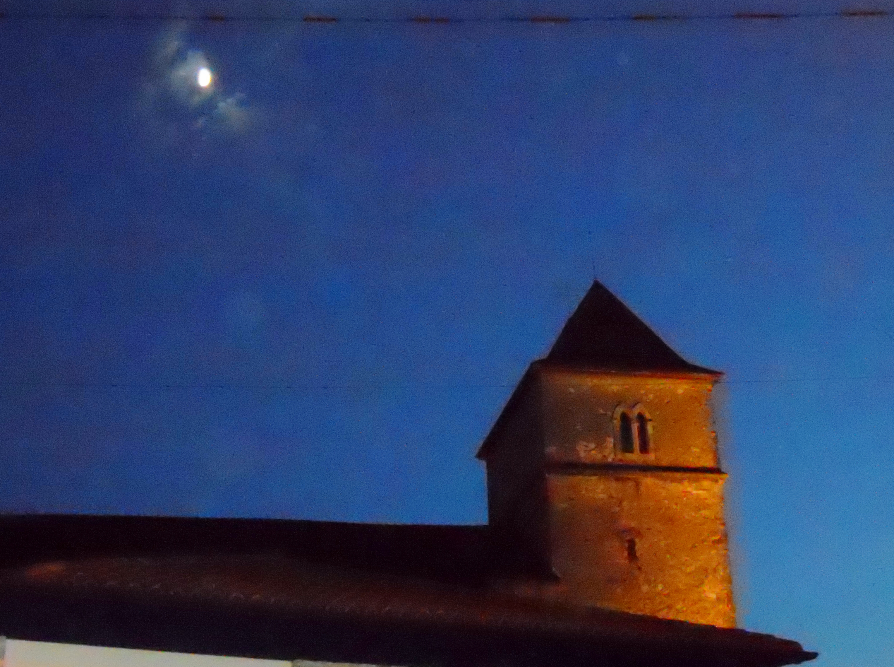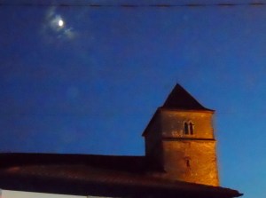 My day is done. On the way home I catch a sight of the moon hanging low over the old church steeple: the perfect image to close the day. What more could one ask of a Saturday in Salies? Life here turns into a work of art, telephone companies and stray kittens notwithstanding.