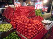 We had walked past the fruit stalls and were working our way through the vegetable section when I saw the mountain of ripe tomatoes: