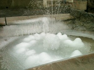 It was surprising that not everything froze, especially when the temperature dropped one night down to -11º C, but most of the plants and trees that usually keep their green in the winter seemed more than able to survive.   Every day, as I walked (or rather waddled in all the clothing) on my way to the Café, I would wonder at the changes in the fountain; what a delight that they had left the water on.