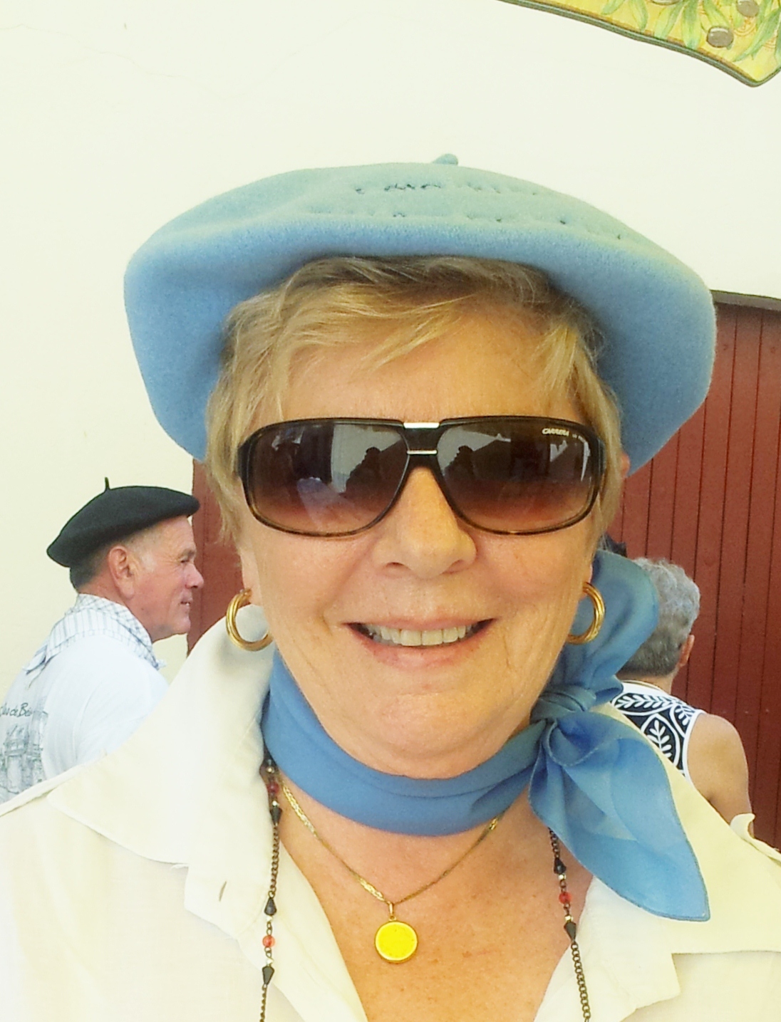 The summer before I moved to Salies was the first time I attended the Salt Festival. The crowds were so thick that walking was impossible and I remember thinking that I wouldn’t do it again. I watched the traditional race known pompously as The World Championship of Sameaux Carriers, “sameaux” being the wooden barrels in which the salty water is transported from the source to the individual houses where the salt itself is extracted. It was different but ultimately boring, not the sort of thing I would make a habit of. Yet today, Sunday, the last day of the Festival, after having finished our morning coffee I suggested to Kiwi-san that we stroll through the Place Bayaa and take a look at the festivities. This we did, in spite of the fact that Salomé was pulling at her leash in an obvious desire to go in the opposite direction away from the crowds and the noise. We wandered past the stands selling local arts and crafts, and culinary products of the region, and strolled out into the Place Bayaa, now completely occupied by makeshift bars selling beer and wine hand-over-fist, and a stage set up with a sound system that looked like it might rock the surrounding houses once it began producing. I shivered at the thought of what might happen to Salomé’s ears if we stayed for the party. At some point of our walk, our ways separated as Kiwi-san headed for his car and home, and I decided to wander a bit more. On the way, I passed a table offering Bearnaise berets. The year before they had been in the same place and I had admired the light blue beret the saleslady was wearing. However, they only had black ones for sale as the blue ones were specially made for the organizers of the event. This year there were blue ones on the table! I couldn’t resist, of course, and ended up doing the rest of the tour looking like this.