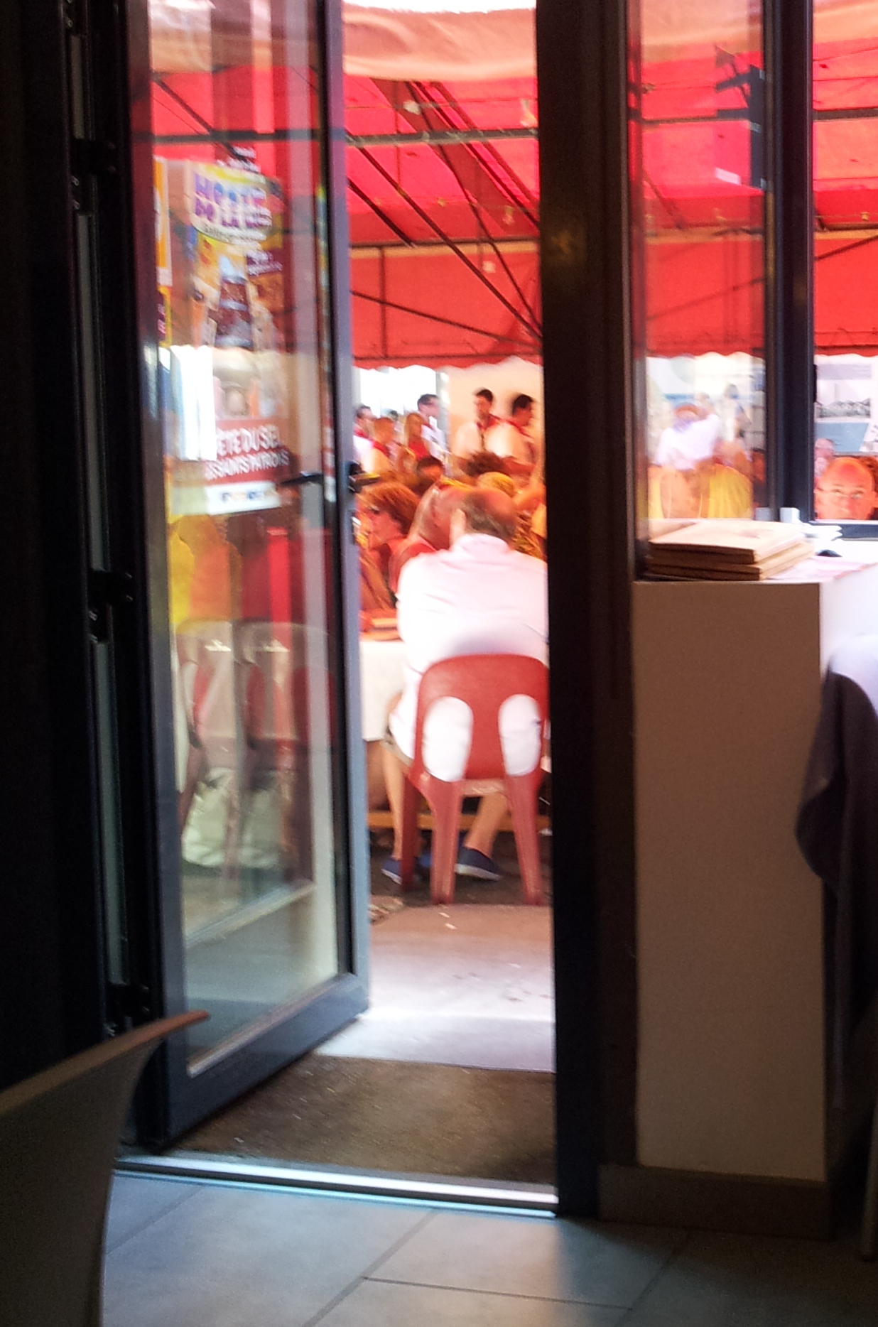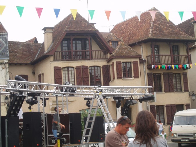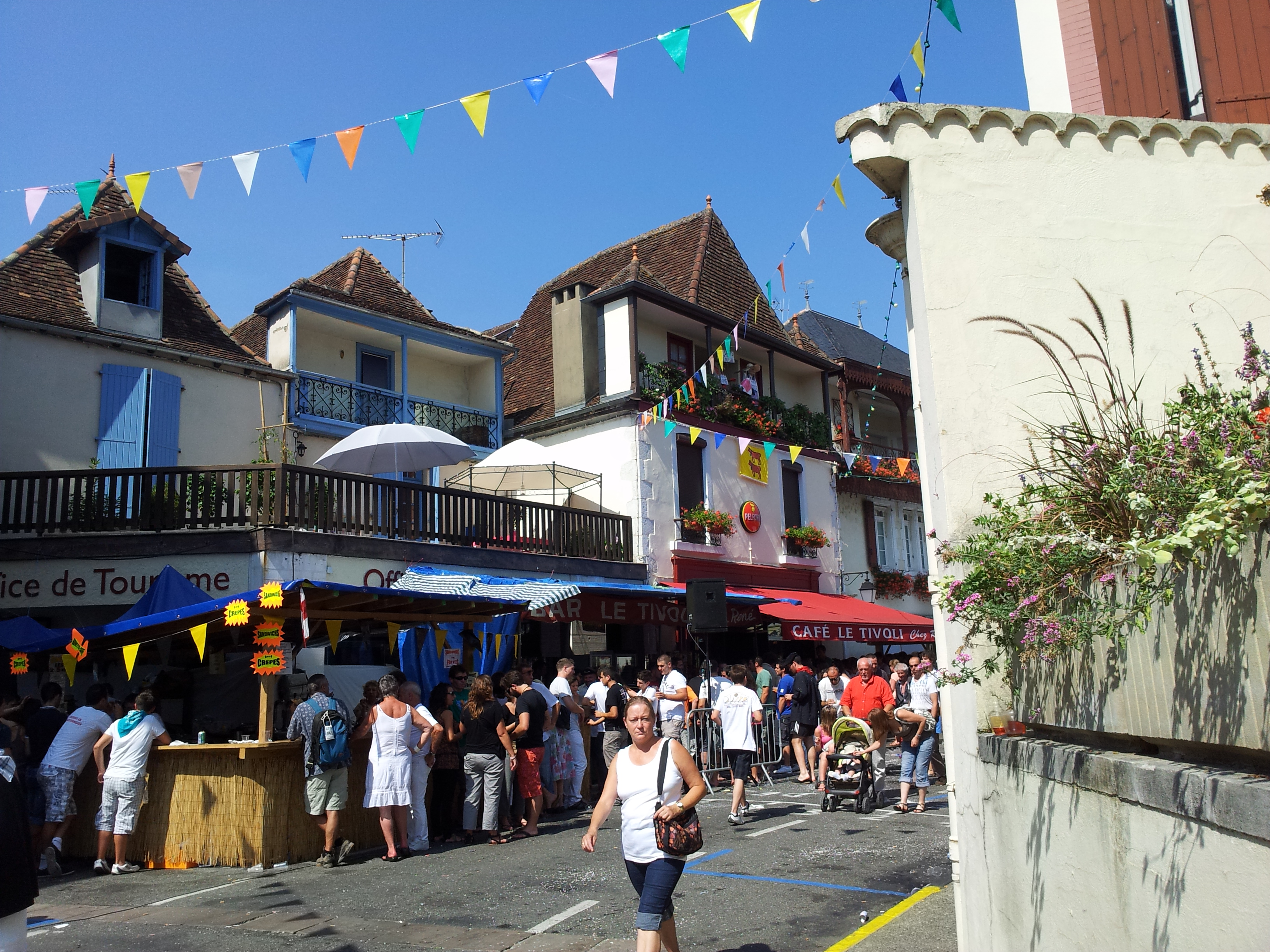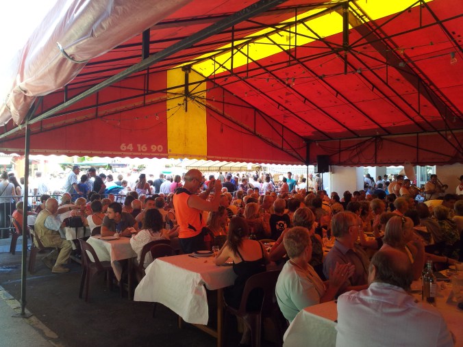 Walking through the crowds without Salomé was easier and I was more relaxed not having to worry about her delicate ears. At the outside bars, the young were well on their way to getting drunk (something almost everyone does during the Fêtes) and I found myself having to duck occasionally while they sprayed each other with beer. People milled around with a glass of wine or beer in their hands, drifting from bar to bar, nibbling on French bread stuffed with chipolatas (a kind of sausage popular in the region) or a basket of French fries. The town had announced it would serve a banquet to over 800 people (a little less than 1/5th the population of Salies) and enormous red tents filled with row upon row of long tables had taken up the far end of the Place Bayaa. Most of the tables were already occupied and waiters wove their way between them placing uncorked bottles of wine at a rate of one bottle per four people. I had not bought a ticket to the banquet: sitting alone with 800 others was not my  idea of fun. I had already gone to one public banquet the first time I visited Salies and had had my eardrums tortured to death by local bands with nothing but wind and percussion instruments. Off to the side, one of the better restaurants in Salies offered an appetizing Menu de la Fête and luck was with me: there was one small, unoccupied table in the center of the room. As he ushered me to the table, the owner explained that I would have to wait a bit to be served. Considering that no French restaurant is ever in a hurry to serve you, and when it does so after what may seem like an eternal wait, it is with the attitude that they have finally decided to do you the favor, I simply smiled and said “pas problème”. I figured that whatever time I took, mine wouldn’t be any longer than the knife-sharpener’s lunch. I sat there wishing I had brought a book. Then the music struck up. Fortunately, the players were on the far side of the tent from my restaurant, so the volume was at a level my eardrums could stand. The band was lively. It played the traditional Béarnaise songs that I had heard at every festival and everybody sang along at the top of their lungs and clapped their hands in tune. It was catching. I found myself smiling with delight when the recognizable chords of Zorba the Greek filled the air. One familiar tune after another, both old time and modern enlivened the atmosphere and had us all clapping and singing, inside and out of the restaurant. Suddenly I felt the presence of my father; it was as if he had suddenly manifested somewhere in the crowd, in the singing, the music, the festive atmosphere. He used to bring his first family (I came from his second marriage) here on vacation during the summer. Had he ever been here during a Salt Festival or any other of the fests that fill the summer months? Had he listened to this same music, drunk their beer or wine and eaten chipolatas on French bread? He was right there in my imagination, so close, so real that my eyes filled with tears and my chest split open with gratitude. What had I done to deserve this, this small town with its seams bursting with life at every turn? To say that I was happy at that moment would have been a gross understatement: I was fall-to-my-knees ecstatic, I was life-can’t-get-any-better grateful and the love for what I was living at that moment felt as if it wouldn’t fit inside one second more. Then lunch arrived and I came back to earth. There was a first dish, a main course, dessert and coffee. It took two hours with the long stretches between servings. The music played the whole time. The crowd outside in the tent clapped, and sang and ate and drank and began again. I paid my bill and looked at my watch. It was three fifteen. He had said five o’clock but maybe luck would have it that he had done the job. I walked slowly back to the War Monument. It was hot, the sun burned my arms and neck; I was beginning to feel tired, my left foot was hurting from all the walking back and forth I had done during the morning.