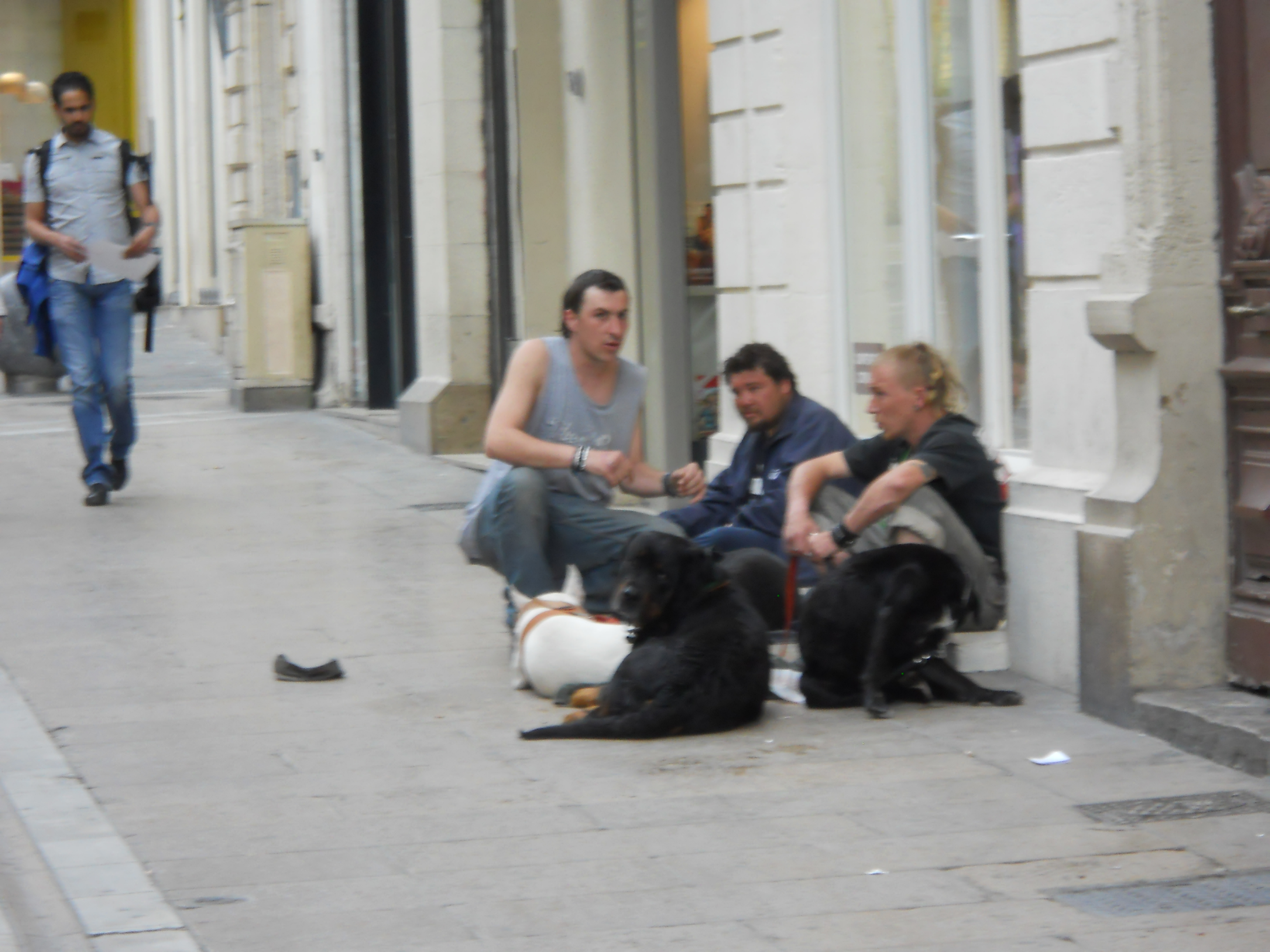 If the drive down had been uninviting to say the least, what I discovered on foot was even worse. Under a cloudy sky, the rundown buildings spoke of misery and abandonment; the sidewalks were strewn with discarded beer cans, empty bottles, paper cups and empty cardboard boxes, and the center itself seemed to be populated mainly by groups of Montpellier 105forlorn men that frightened me, invariably drinking beer and accompanied by large menacing-looking dogs. As I looked for the street where I hoped to find the school, I clasped my bag to my chest with all my might expecting to be assaulted and robbed at every corner. Thanks to a taxi driver who was kind enough to give me directions, I found the street and the school. It was installed in an ancient building on a pedestrian street lined with boutiques and eateries. Of course, being Sunday, everything was closed. My trip, however, had been successful for I discovered that the tramway stop I needed was but a block and a half from the school (the starting station is a block away from the residence) so I could save myself the expense of driving in every day.