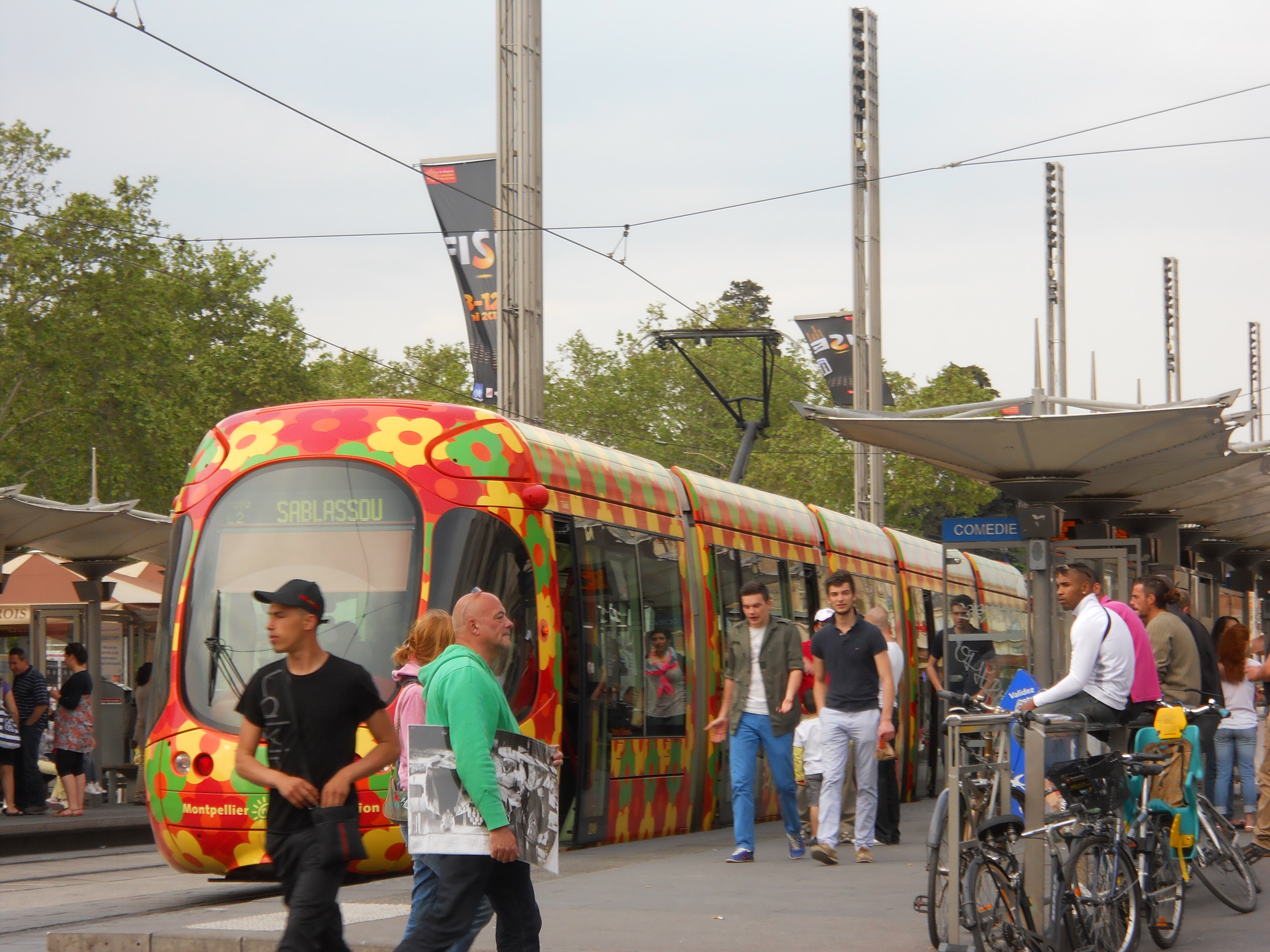 This first experience left me with the impression that the most attractive thing in Montpellier is the trams. Painted each a different color Montpellier 120and design (mine is red with white and yellow flowers; another is sky blue with white gulls outlined; still another has a modern mandala-like design) they brighten up the otherwise dull, disheveled and dirty streets.Montpellier 117