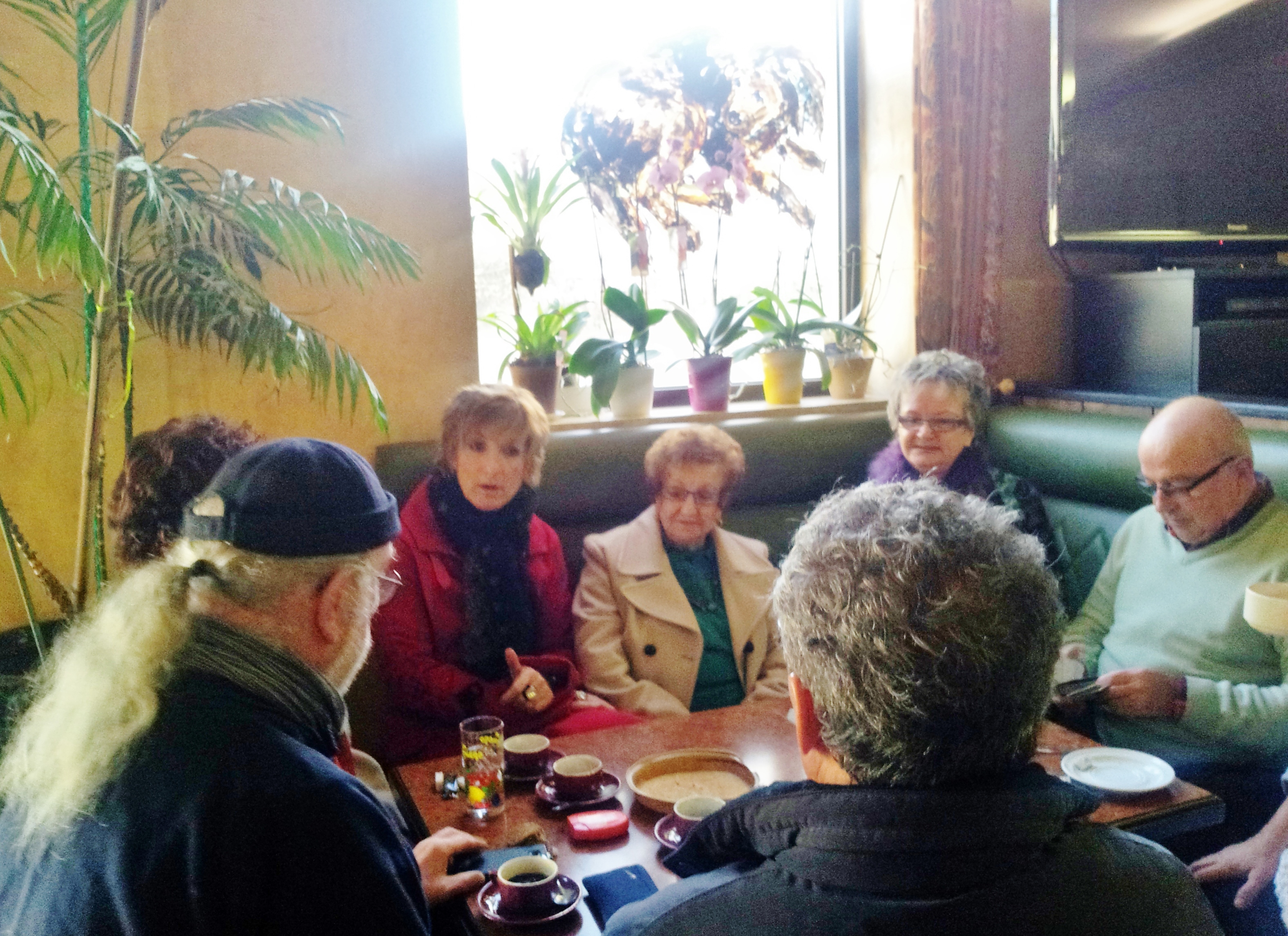 And there you go, in the interem of thinking all these thoughts I have arrived at the Café. My friend Josée is there, without her umbrella that she has returned home before coming, and my friend Eliane one, and Eliana two, and Isabelle, Bibi and Gegé 20121209_102422and Jean. I sit, releasing Salomé to make the rounds of the tables hoping for a croissant and receiving at least a caress. Bernadette brings a cup of steaming coffee and a glass of water that she places in front of me.