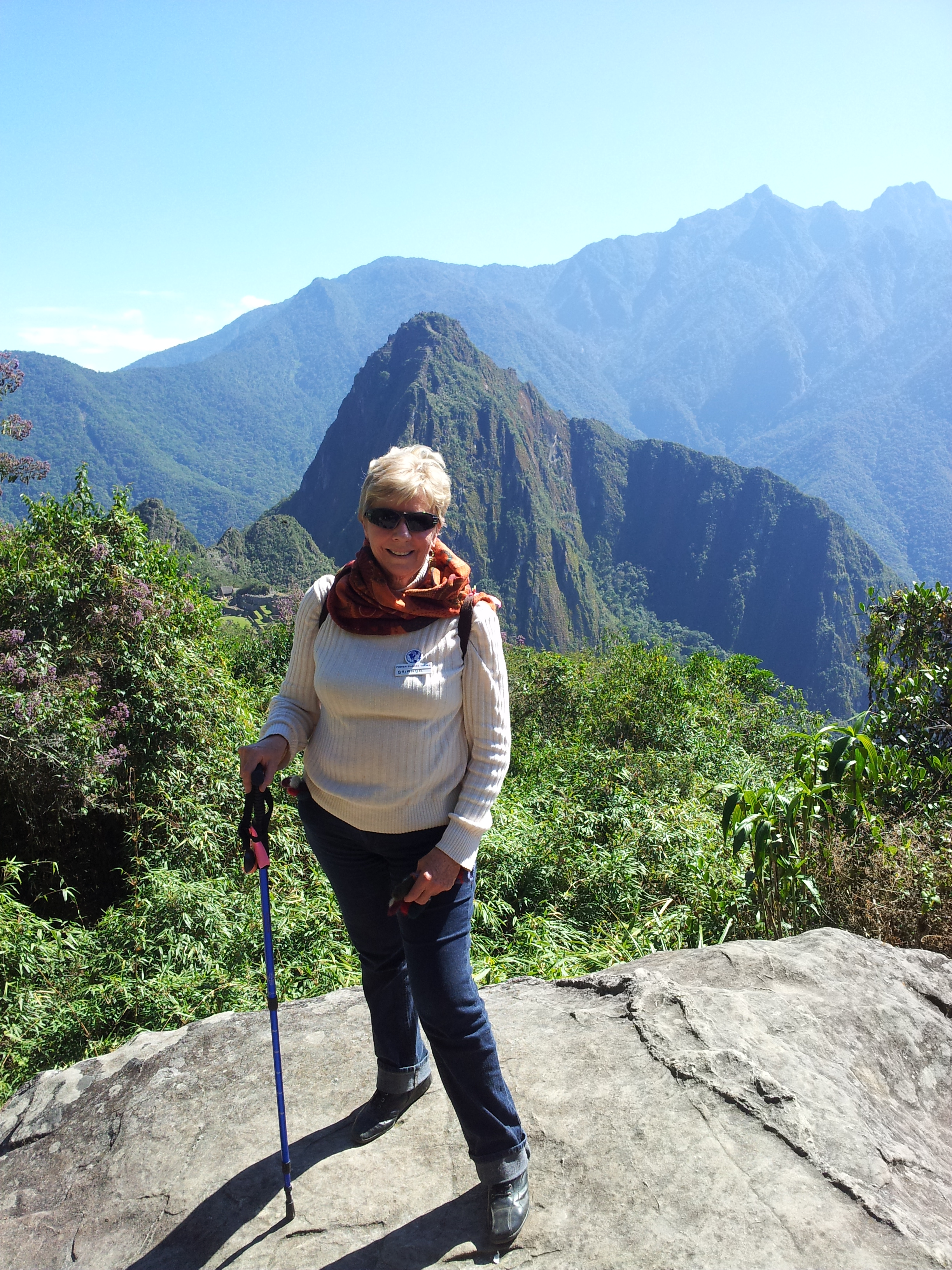 arrived, breathless but exhilirated at 14,000 ft. I knew that it was for this that I had come, for these incommensurable upliftings of granite reaching for the unfathomable blue sky to enter into my eyes and my soul, expanding a heart that was already beating its way out of my chest as I gulped in the thin air and fell to my knees in awe. On that mountain top, above the impressively high Mayna Picchu that towers over the ordered stones of Machu Picchu, gazing down at the miserably dwarfed human expression of the ruins below and out across range upon range of Earth at its most magnificent with its rocky or snowy mountain tops, its glaciers, its jagged peaks, its