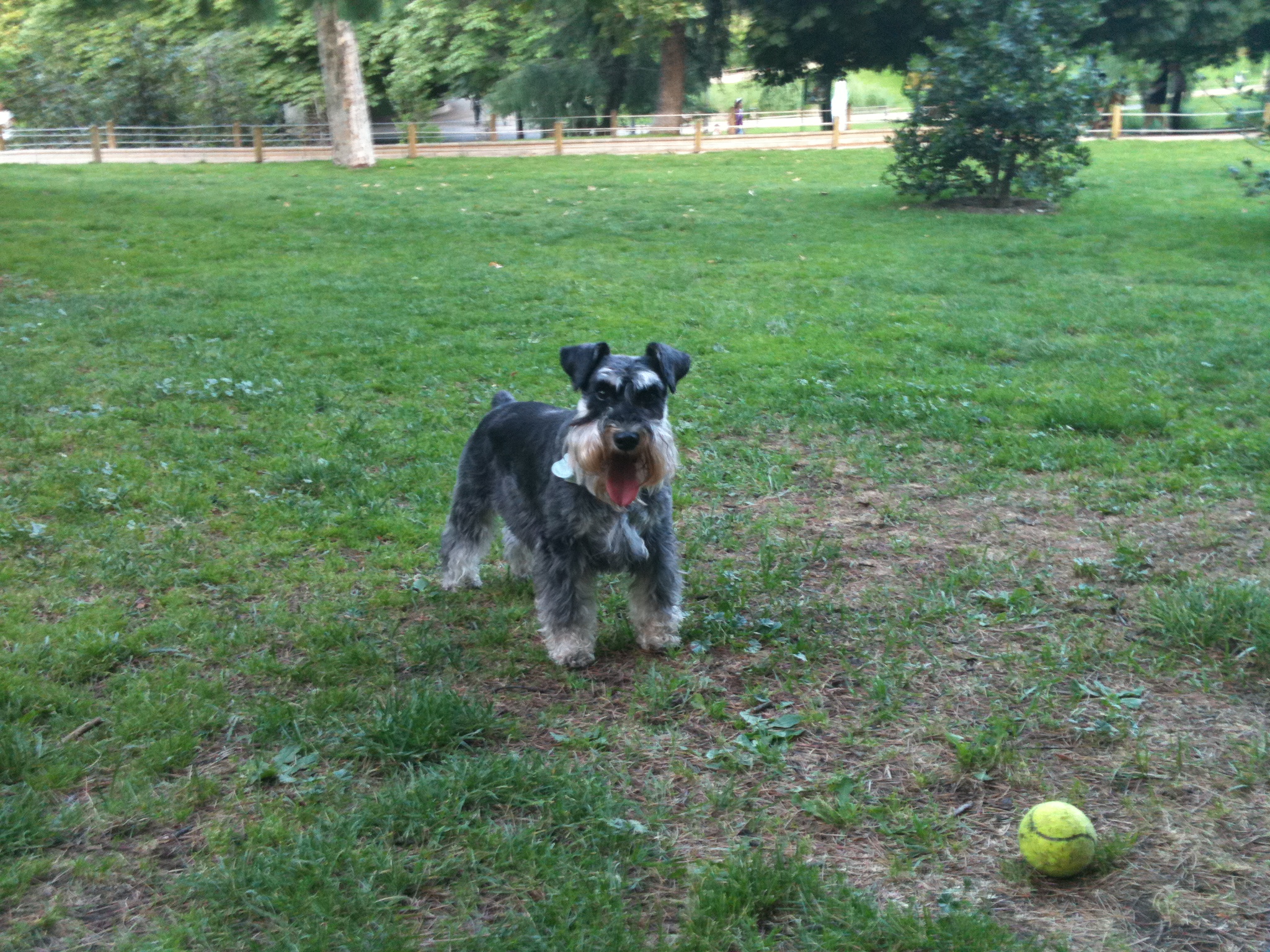 The other negative experience came from one day when I was throwing the ball for her across the driveway. A car come zipping in and Salomé disappeared underneath. I screamed so loud, the car stopped. I continued screaming because my mind was flashing pictures of a mashed and bloody Salomé, hurt beyond repair and suffering. Terrified I rushed over, knelt down and extracted her from right next to the front tire. She didn’t have a scratch on her, but nonetheless my mind kept playing over and over the horrid imagined images. To calm myself, I cuddled her in my arms, although all she wanted to do was to continue playing with the ball. Because her reaction had not been immediate, I thought there was none (I thought…) but I was wrong. A few days later, I was throwing the ball once again in the driveway (but from where I could see the entrance so as to catch an incoming car) and she was chasing it, when suddenly I threw it and she sat down and watched it roll away. This happened a few times and I could see she was afraid of running after the ball, but there was no car. I began throwing the ball on the lawn so that the driveway was not involved, and once again, she went for it several times and then suddenly 002 (2)stopped. No car, but she was obviously afraid of something.  After trial and error, I finally got it. It was not the sight of a car that frightened her, but the sound of the motor which, in each case, had been produced not by passing traffic, but by some car coming into an adjoining driveway when there was no noise of traffic on the street outside. When this happened the moment she was about to chase the ball, she stopped dead in her tracks and sat down. It was obvious that she had not seen the car, but had definitely heard it