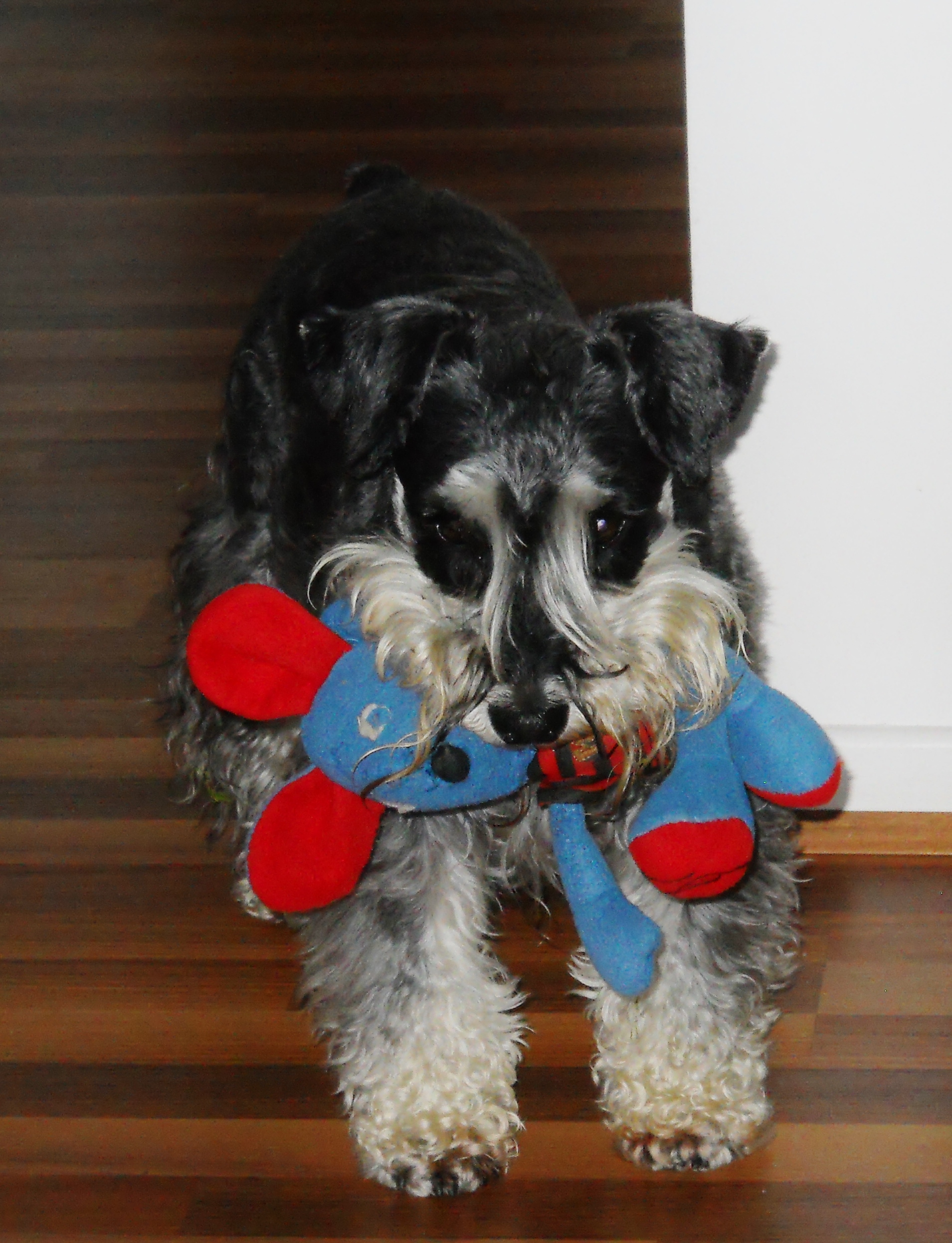 When she wants my attention, she will come to where I am and intensely gaze at me. I will then tell her: “Go get Squeak (her little blue mouse)” or “Bring the sock” or “Look for the ball”. She’ll stand gazing at me for one or two seconds, turn her head in the direction of her toy basket, look down at her feet for a split second more and suddenly get up, trot to the basket and pull out the toy I have asked her for. It is not an ingrained reaction: she has to think about it, turn it over in her mind (the name), find the right image and go get it.2012-2013 Nikon 041