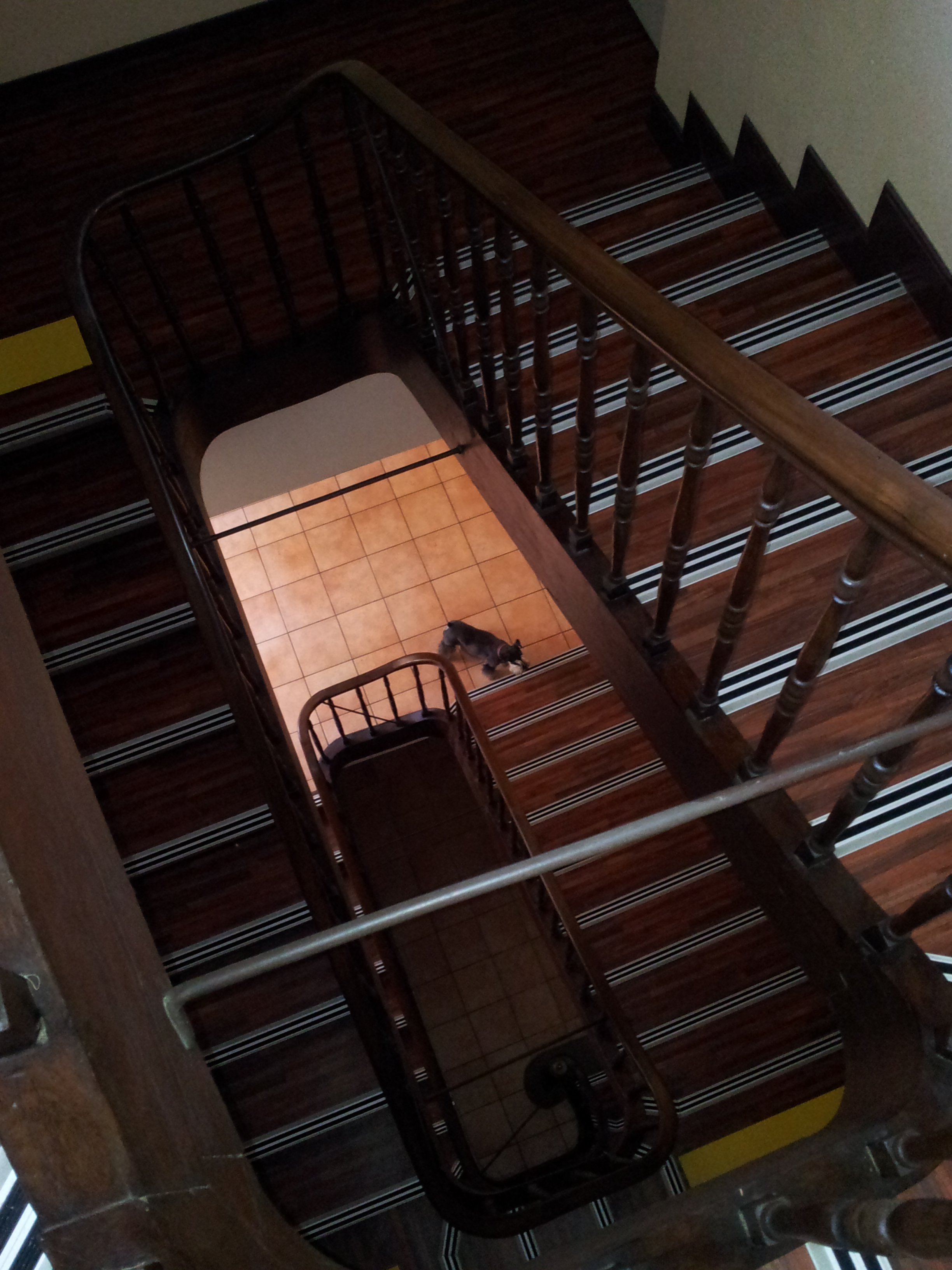 What I find so fascinating about the thinking caused by fear in Salomé’s case is that no matter how many experiences to the contrary, she has a pattern ingrained by fear that is indelible. To me this explains a lot about the supposed “traumas” humans suffer as infants, and the fact that they can determine behavior during a whole lifetime if not attended by therapy or some other effective method. Take the stairs for example: Salomé slipped once yet every time she faces the climb, her mind repeats the danger as a ‘given’, which makes her body react with fear without the actual slipping being necessary.  If she were a human child, and were not helped over this initial fear (which repeats even if the act does not), she would, upon looking back much later, probably express as: “When I was young I always slipped on the stairs”. A therapist would ask her to remember exactly how many times this had happened and, wouldn’t she be surprised to finally realize it had actually happened only once. I have tried to explain this to Salomé, but alas, the lack of a spoken language prevents me from changing her pattern.